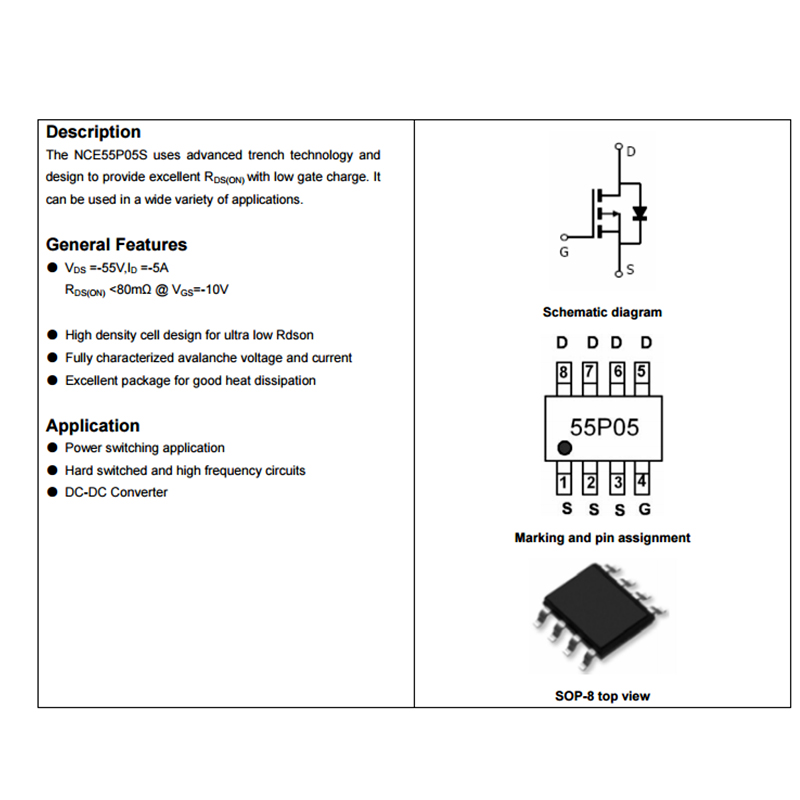 NCE55P05S貼片 MOS場(chǎng)效應(yīng)管 P溝道55V 5A SOP-8